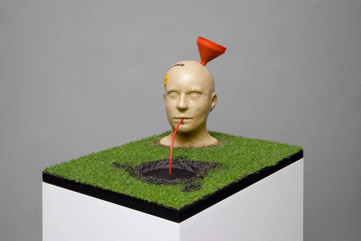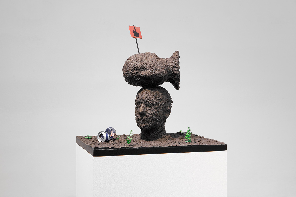 Soil, acrylic, plaster, aluminum can, artificial plants, cardboard, wood, acrylic paint, chipboard, base /